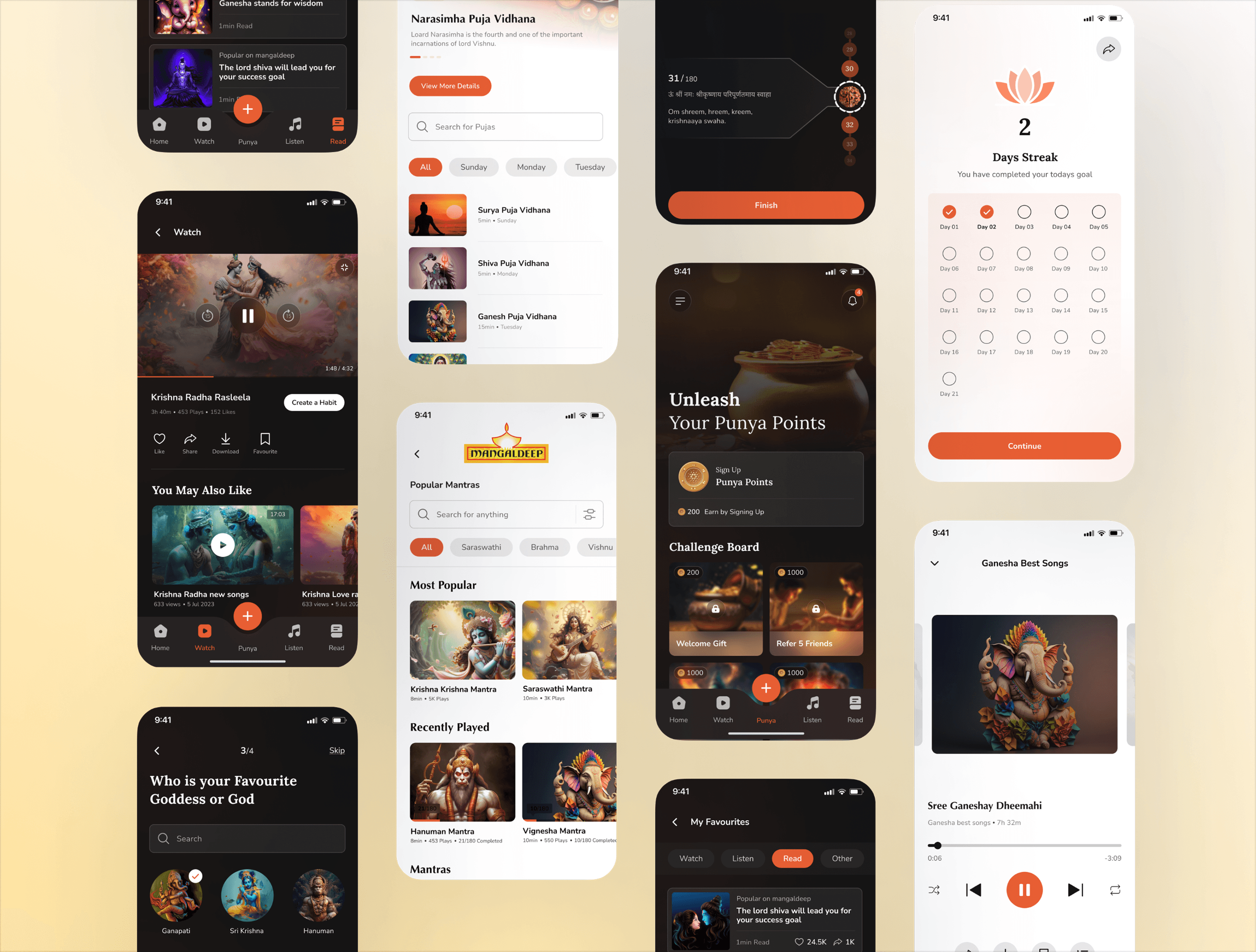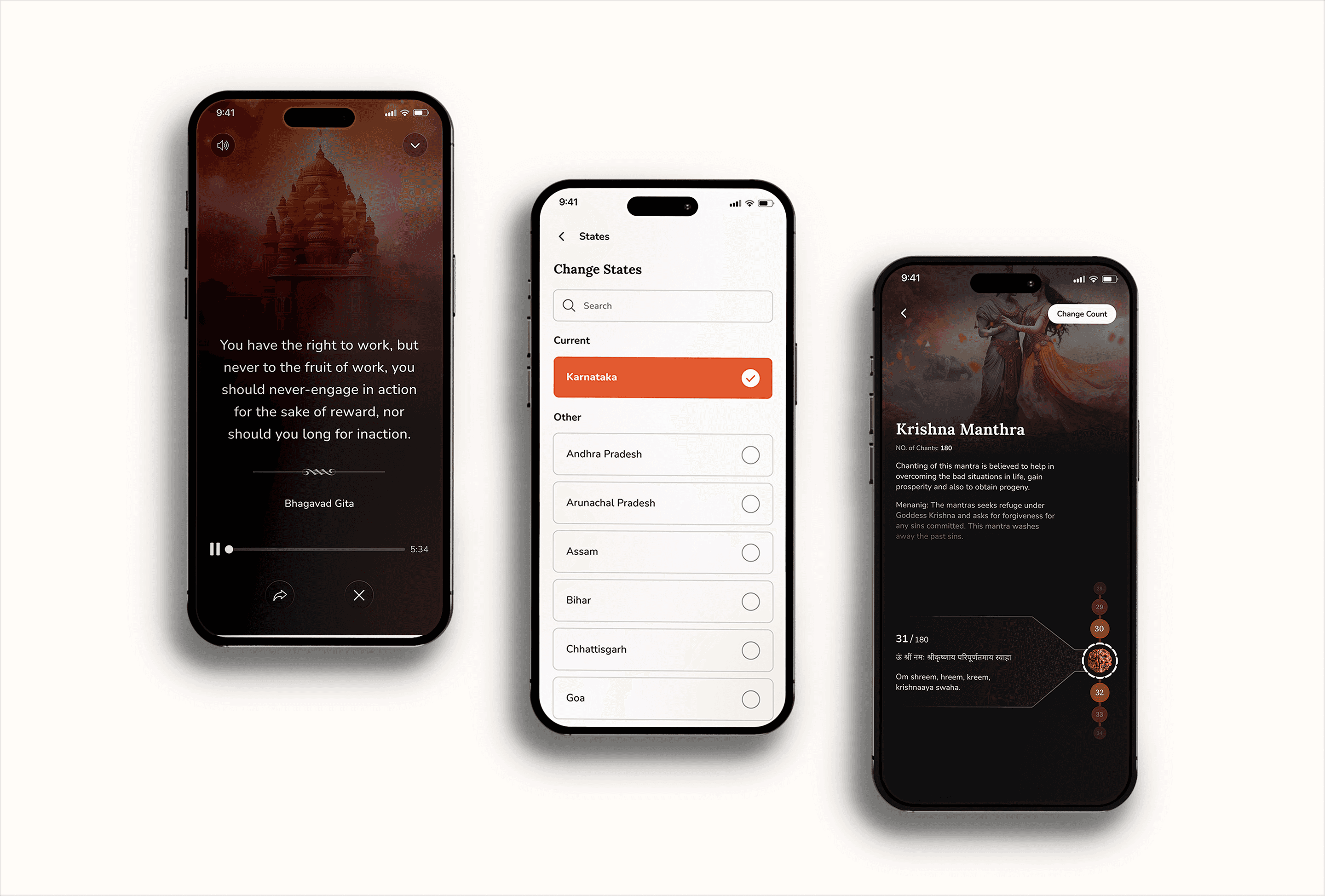 Used warm tones, soft gradients, devotional iconography, and mindful spacing to create a peaceful environment.